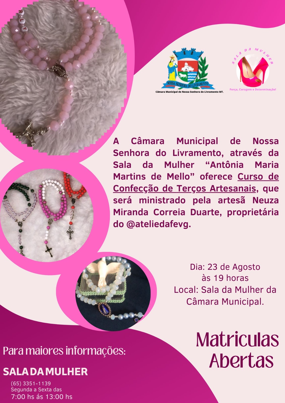 A Sala da Mulher, vinculada à Câmara Municipal de Nossa Senhora do Livramento, promove curso de Confecção de Terços Artesanais para pessoas se capacitar na área artesanal que ajude na melhoria de renda financeira. O curso será ministrado pela Artesã Neuza Miranda Correia Duarte, com início na próxima quarta-feira, 23 de agosto, às 19h.